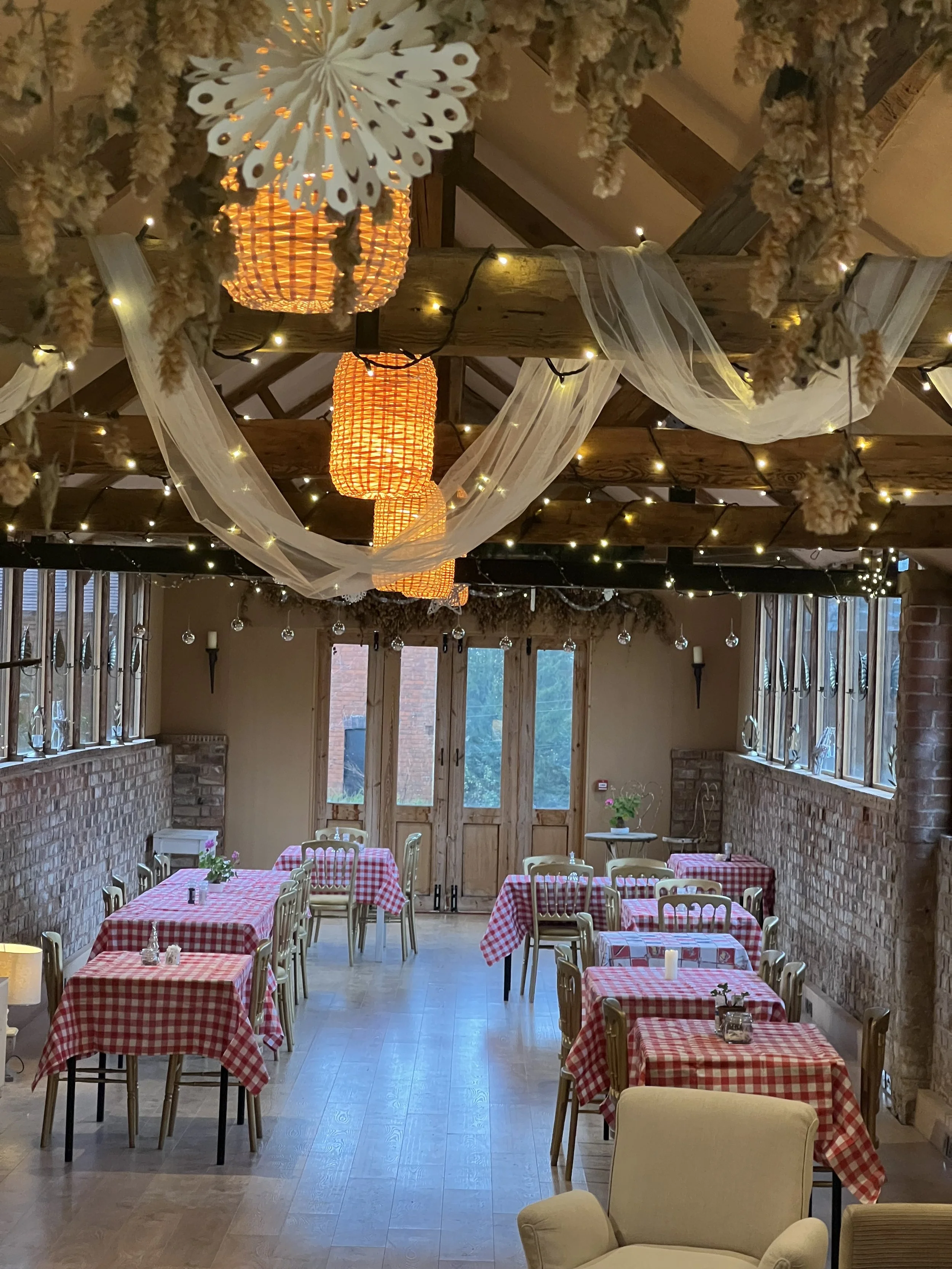 The Saw Mill is a combination of brick, old beams and glass. It suits a variety of uses from exercise classes to a proms. It connects to The Dutch Barn, a wonderful spacious, white painted building that has hosted art galleries and plays. The two even stapces are supported by our catering kitchen and our soon-to-be-fitted bar.